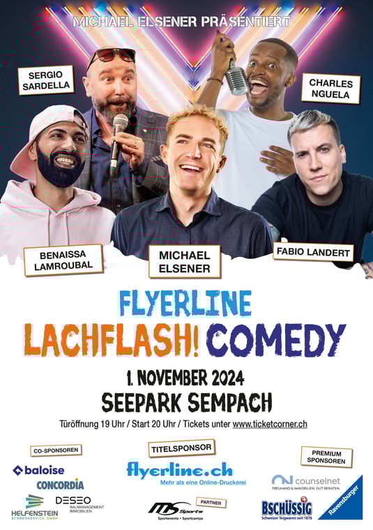 Zum dritten mal organisiert man im Seepark Sempach die Mixed-Show LACHFLASH! Es freut mich, dass ich dieses Jahr mit dabei sein darf. Michael Elsener moderiert und im Line-Up treten Charles Nguela, Fabio Landert, Benaissa Lamroubal und Sergio Sardella auf. Ein echtes Potpourri der Schweizer Comedy-Szene... ci vediamo in Sempach.