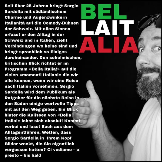 SERGIO SARDELLA steht seit über 25 Jahren als Comedian vor Publikum! Nummer 7 ist da! Mit der Première des neusten abendfüllenden Programms von SERGIO SARDELLA macht man eine Reise ins südliche Europa. Mit dem Programm BELLA ITALIA! karikiert der eingebürgerte Agglo-Secondo aus EmmenBRONX den täglichen Wahn, die Besonderheiten und Macken bei unseren Nachbarn. Einerseits klärt er auf, andererseits hält er den Spiegel vor und zieht wie üblich die schrägsten Verbindungen, wo keiner sie...