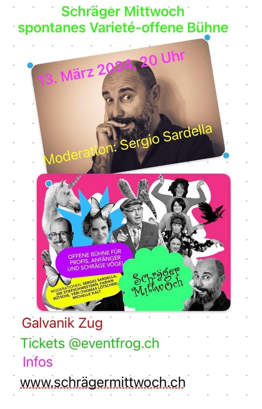 Der SCHRÄGER MITTWOCH kommt zurück und spült wie jedes Jahr ein Potpourri der Kleinkunst auf die Oberfläche der Bühne in der Galvanik Zug! SERGIO SARDELLA moderiert den Eröffnungsabend der Ausgabe 2024. Kommt vorbei und lasst Euch von den verschiedensten Genres der Kleinkunst unterhalten - der Name Schräger Mittwoch ist ein Versprechen für Abendunterhaltung der anderen Art! Ci vediamo - a presto!